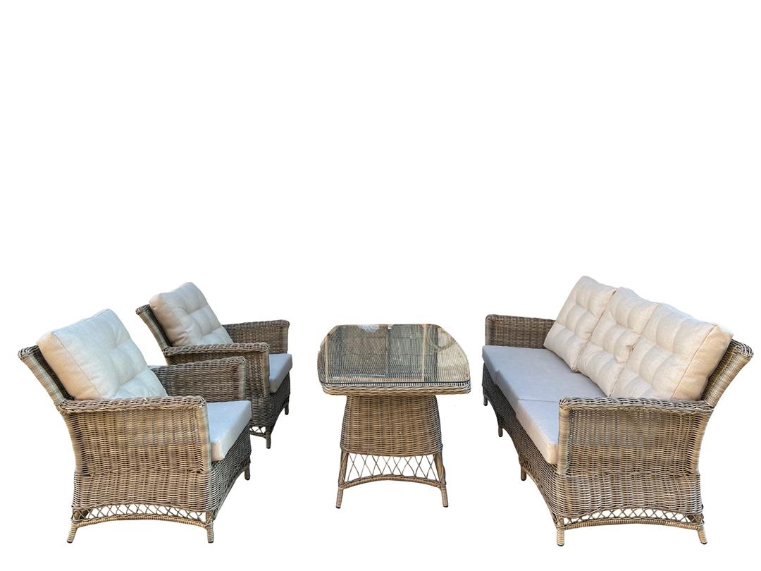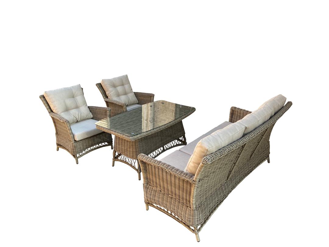 Komplektas pagamintas iš aplinkai atsparaus apvalaus dirbtinio ratano ir milteliniu būdu dengto aliuminio rėmo. Šie baldai atsparūs UV spinduliams, drėgmei, šalčiui, lietui. Apvalaus ratano vytelės baldams suteikia prabangą ir natūralumą.