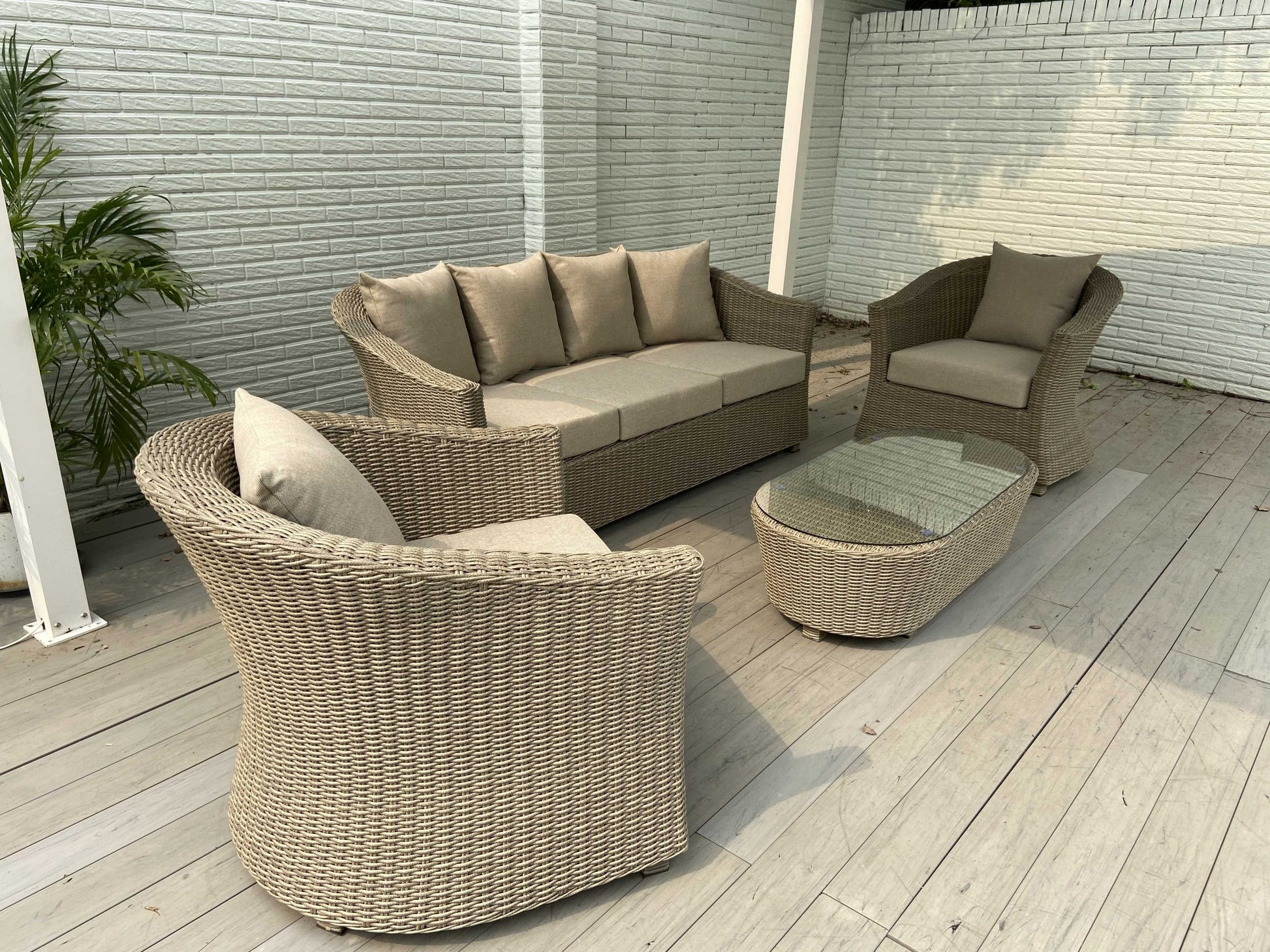 Komplektas pagamintas iš aplinkai atsparaus dirbtinio ratano ir milteliniu būdu dengto aliuminio rėmo. Šie baldai atsparūs UV spinduliams, drėgmei, šalčiui, lietui. Pusapvalis ratanas baldams suteikia natūralumą.