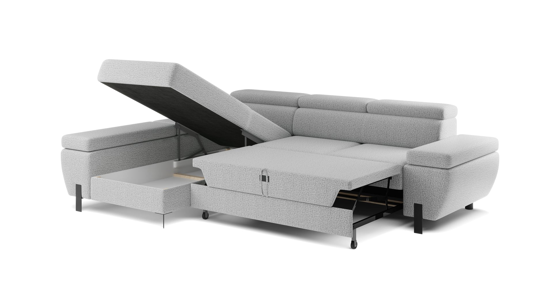 MOLINA S – visiems tiems, kurie vertina modernų dizainą, komfortą ir funkcionalumą. Originalios metalinės kojos pabrėžia unikalų baldų charakterį. Patogūs, reguliuojami galvos atlošai ir kilnojamas porankis užtikrins, kad kiekvienas šeimos narys galės atsipalaiduoti taip, kaip jam patinka. Miego funkcija yra sprendimas visiems tiems, kurie ieško papildomos vietos poilsiui. Baldų viduje paslėpta didelė patalų dėžė suteiks papildomos vietos patalų sandeliavimui.