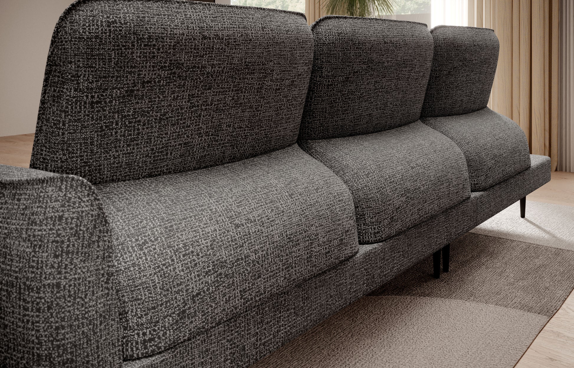 STORM L - tvarkingos ir stilingos linijos. Šios kampinės sofos patiks visiems, kurie vertina modernų dizainą kartu su funkcionaliais sprendimais. Stumdomi atlošai, kurie lengvai pakreipiami atgal, leidžia patogiai pusiau gulėti. Elektra prailginama kojų atrama puikiai pritaikys kampinę sofą pagal individualius vartotojo poreikius. Šio sprendimo dėka baldas ne tik išsiskiria savo išvaizda, bet ir funkcionalumu.