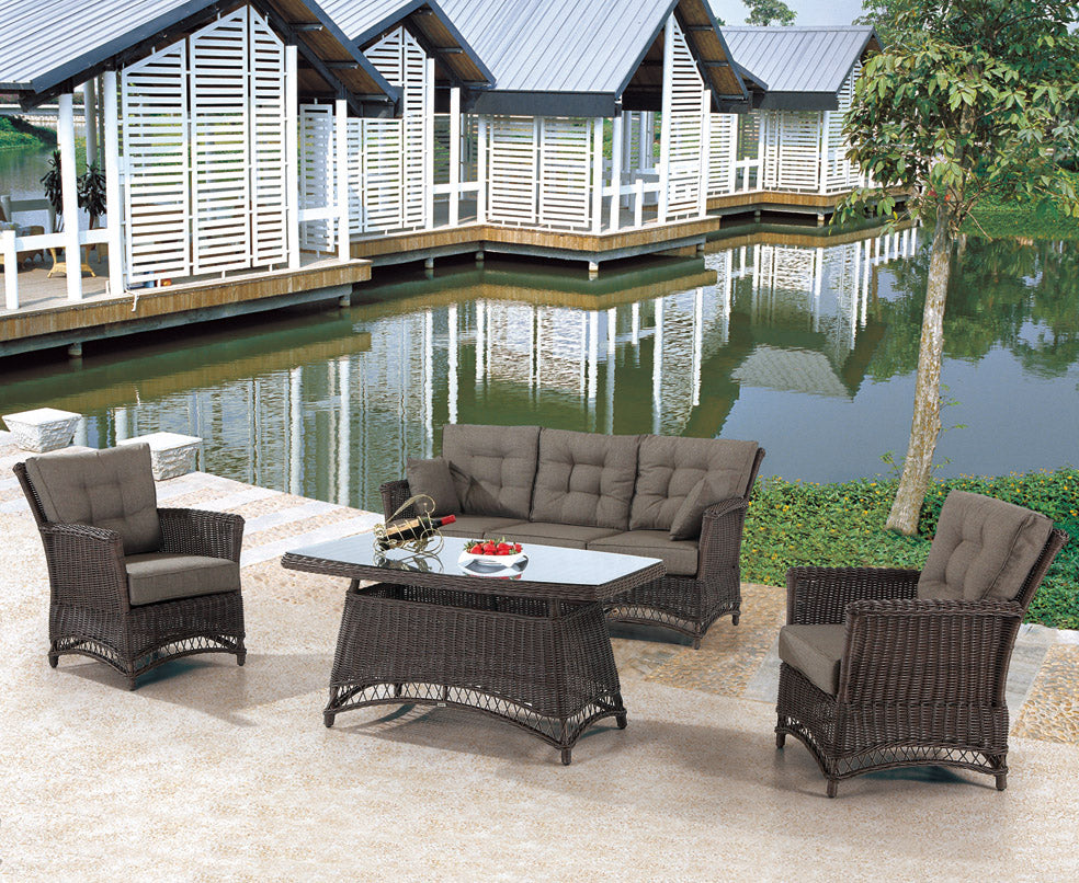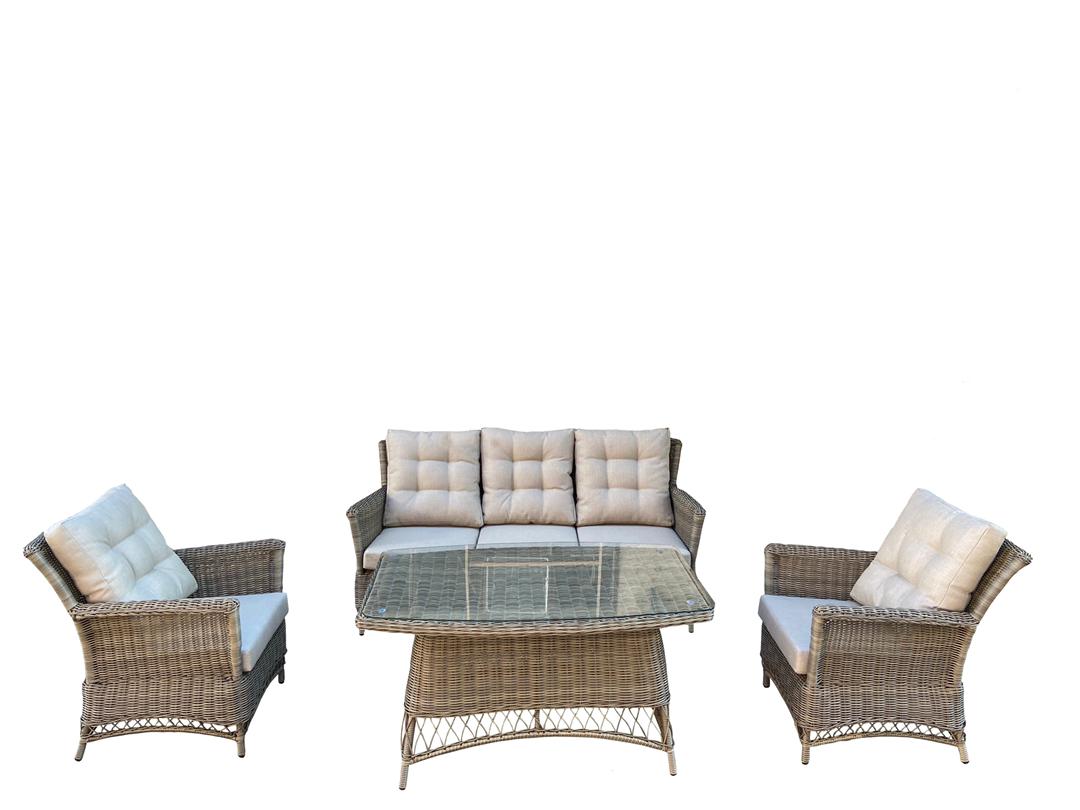 Komplektas pagamintas iš aplinkai atsparaus apvalaus dirbtinio ratano ir milteliniu būdu dengto aliuminio rėmo. Šie baldai atsparūs UV spinduliams, drėgmei, šalčiui, lietui. Apvalaus ratano vytelės baldams suteikia prabangą ir natūralumą.