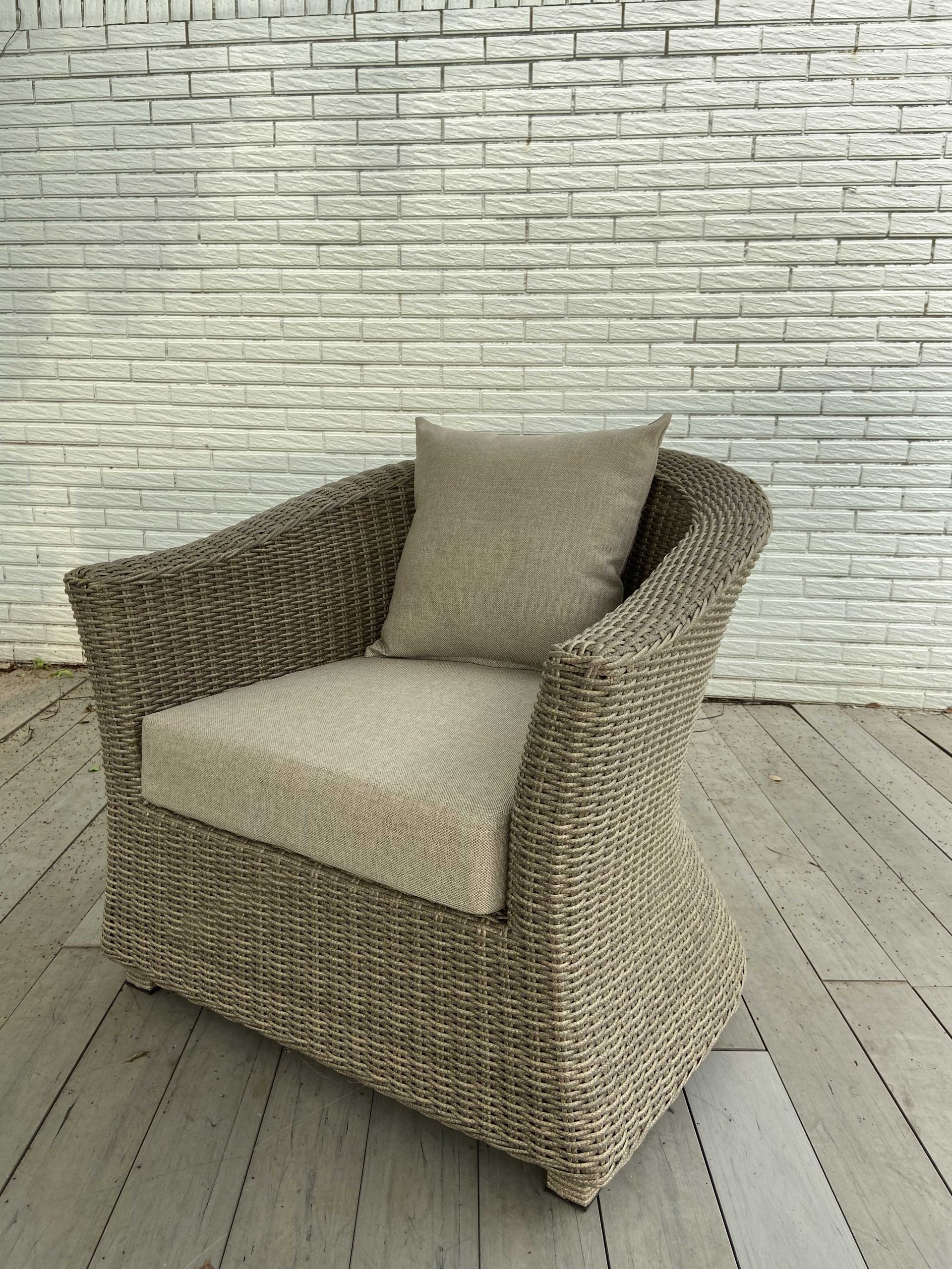 Komplektas pagamintas iš aplinkai atsparaus dirbtinio ratano ir milteliniu būdu dengto aliuminio rėmo. Šie baldai atsparūs UV spinduliams, drėgmei, šalčiui, lietui. Pusapvalis ratanas baldams suteikia natūralumą.