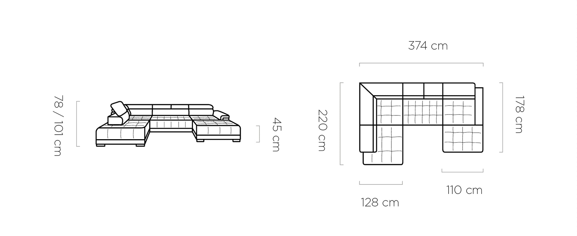 CAMPO XL - nesenstanti forma ir funkcionalumas yra pagrindiniai šių baldų privalumai. Reguliuojami galvos atlošai, miego funkcija ir patalynės dėžė – idealus sprendimas ieškantiems išskirtinio komforto ir praktiškumo. Originalios metalinės kojos pabrėš modernų baldo stilių.