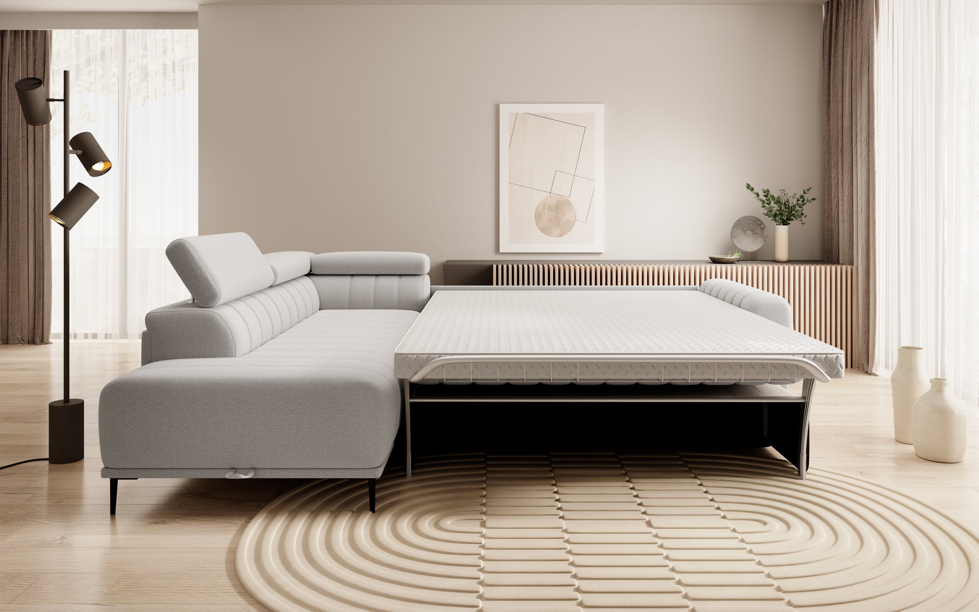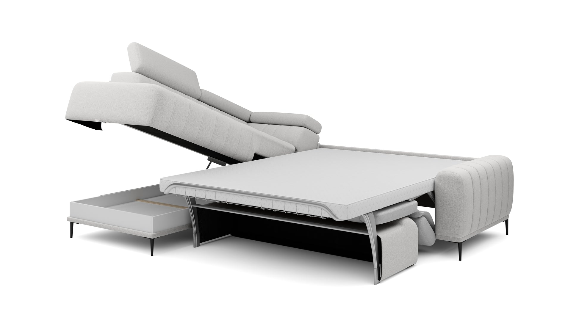 GANDI L – nepaprastai funkcionali, patogi ir stilinga kampinė sofa. Itališka sulankstoma sistema leidžia lengvai paversti ją lova, kurios miegamasis plotas gali būti dviejų dydžių: 120 x 200 cm. arba 140 x 200 cm. Patogi sėdynė ir atlošas su reguliuojama galvos atrama leidžia pritaikyti šį minkštą kampą pagal savo individualius poreikius. Metalinės kojos suteikia modernumo ir prabangos.