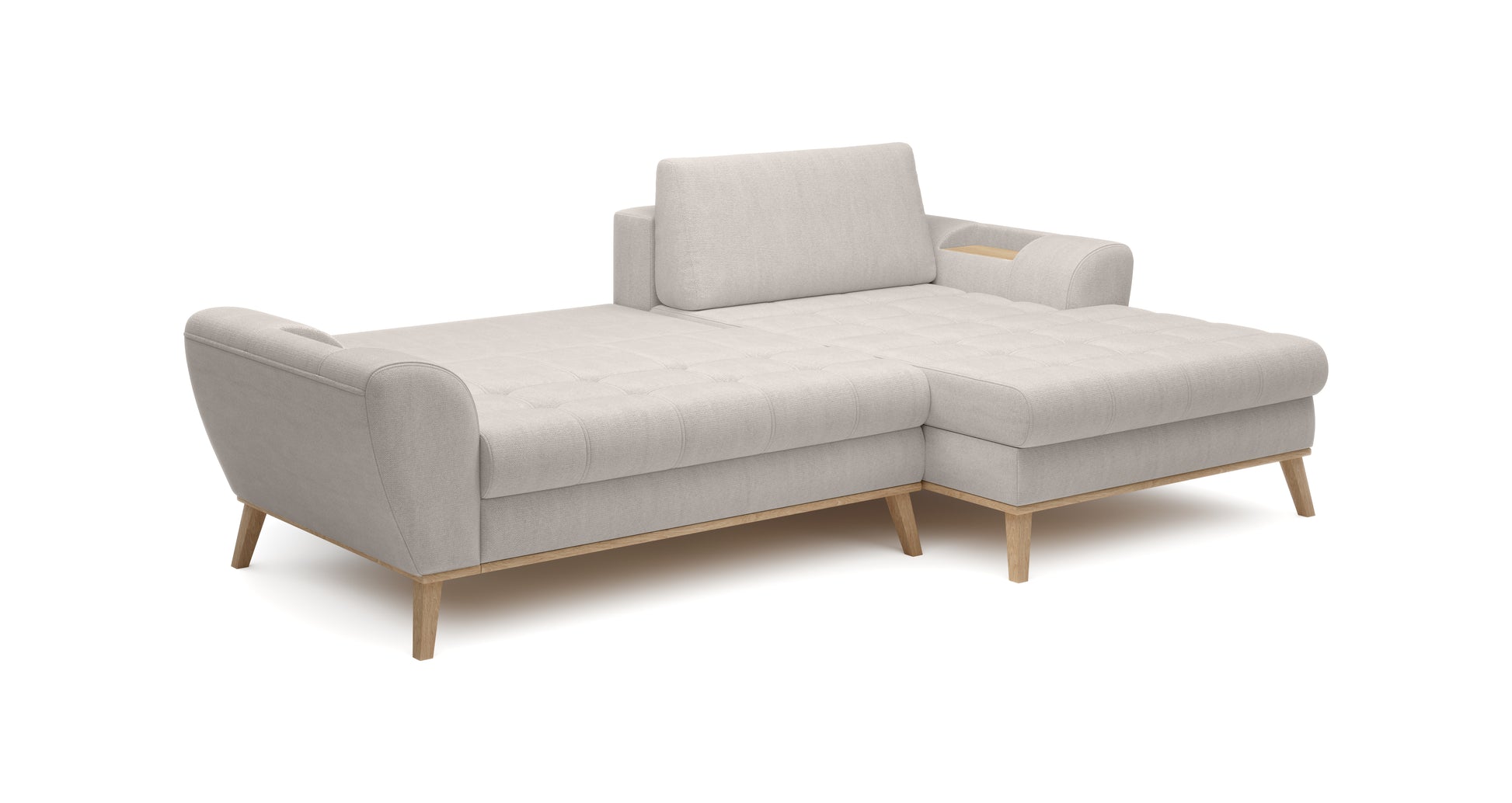 NUBO S - itin patogi kampinė sofa su miego funkcija ir lengvai naudojama automatine "DELFIN" išskleidimo sistema. Kampinėje sofoje yra didelė patalynės dėžė, kurioje galite laikyti papildomą patalynės komplektą. Mažos medinės lentynėlės kampinės sofos šonuose yra puikus sprendimas tiems, kurie mėgsta atsipalaiduoti su knyga ir puodeliu geros arbatos.