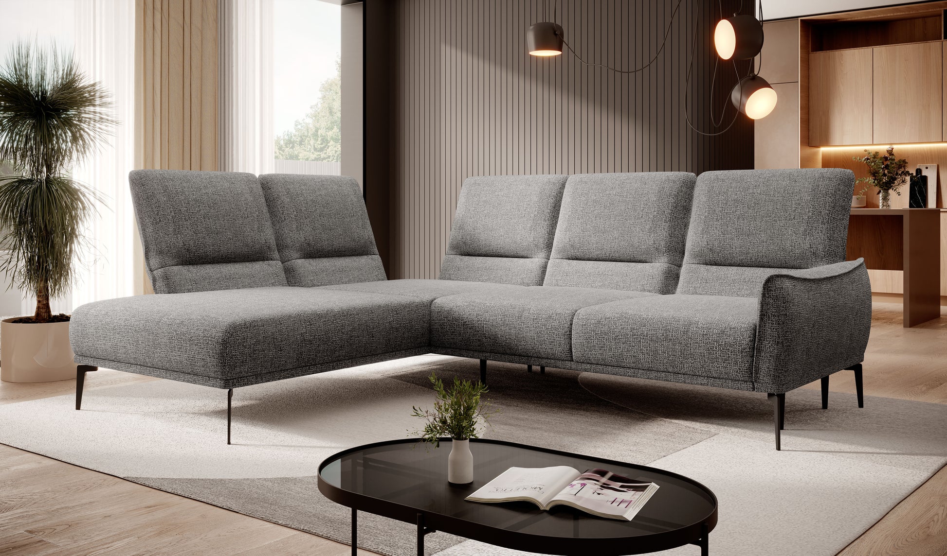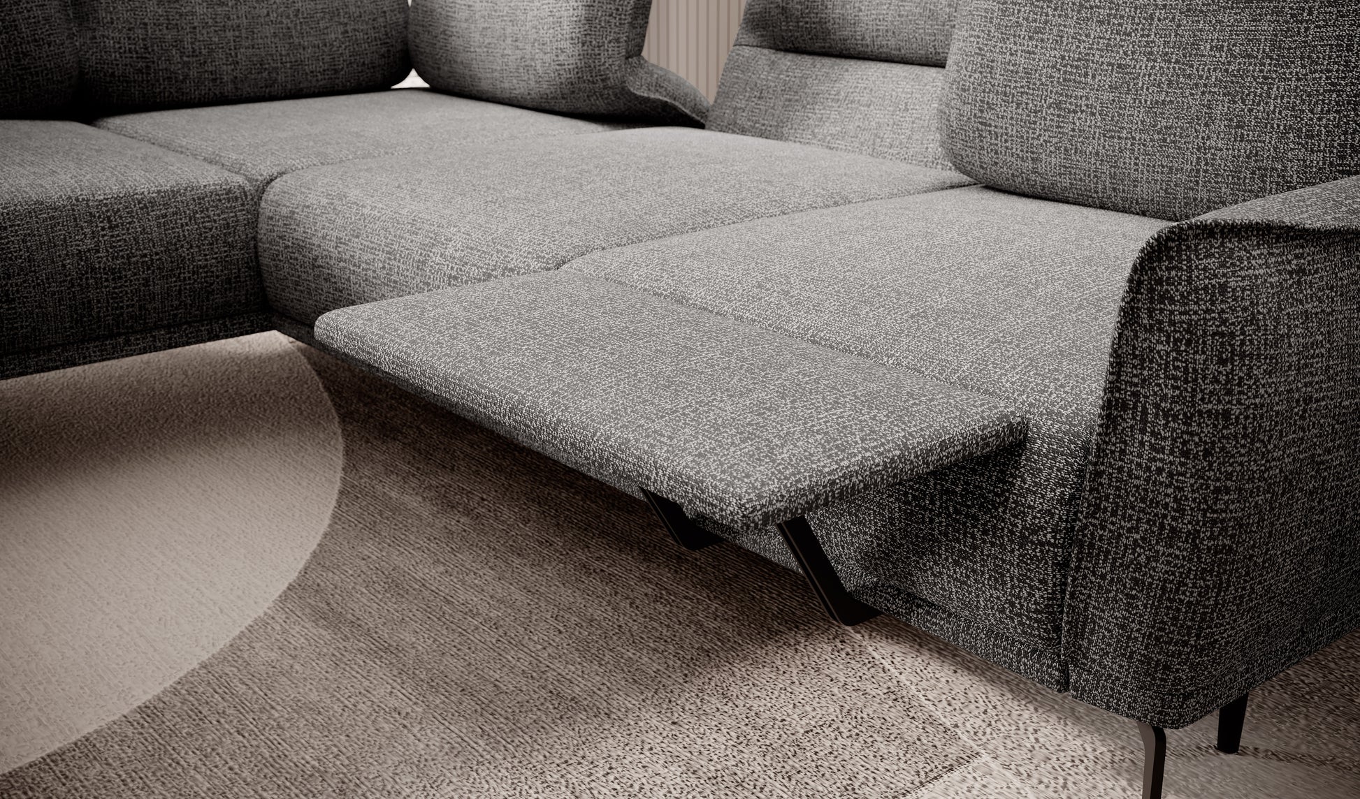 STORM L - tvarkingos ir stilingos linijos. Šios kampinės sofos patiks visiems, kurie vertina modernų dizainą kartu su funkcionaliais sprendimais. Stumdomi atlošai, kurie lengvai pakreipiami atgal, leidžia patogiai pusiau gulėti. Elektra prailginama kojų atrama puikiai pritaikys kampinę sofą pagal individualius vartotojo poreikius. Šio sprendimo dėka baldas ne tik išsiskiria savo išvaizda, bet ir funkcionalumu.